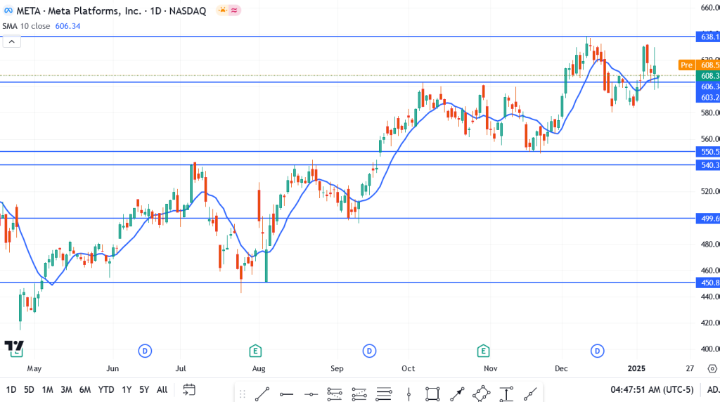 Meta Platforms stock consolidates near $608 amid TikTok ban speculation