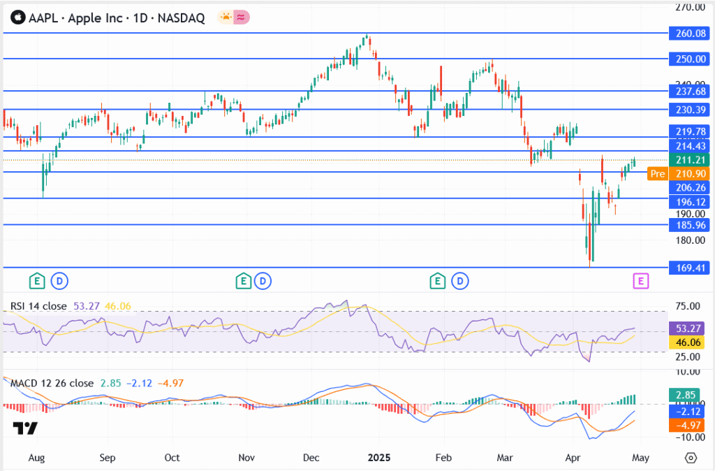 Still, Apple hasn’t reclaimed its pre-earnings breakdown zone at $219. Traders will need to see a firm break above $214 to signal continuation. If that happens, the stock could easily revisit the $230–$237 range from February highs.