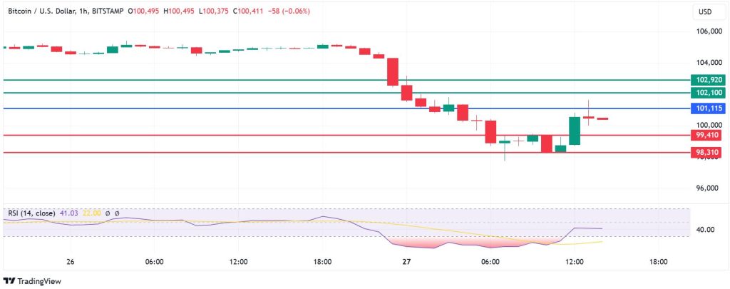 On the other hand, Bitcoin price will likely head to the upside if action goes above $101,115. With the buyers in control, the coin will likely move up to meet the first resistance at $102,100. However, a stronger upward momentum will break above that level and invalidate the downside narrative. Also, that momentum could extend gains and test $102,920.