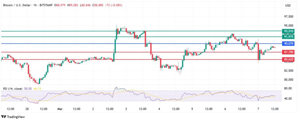 Bitcoin price pivots at $90,070 and the momentum favours the downside to prevail. The coin will likely find initial support at $87,700, but an extended control by the sellers could take action lower to test the second support at $85,620.