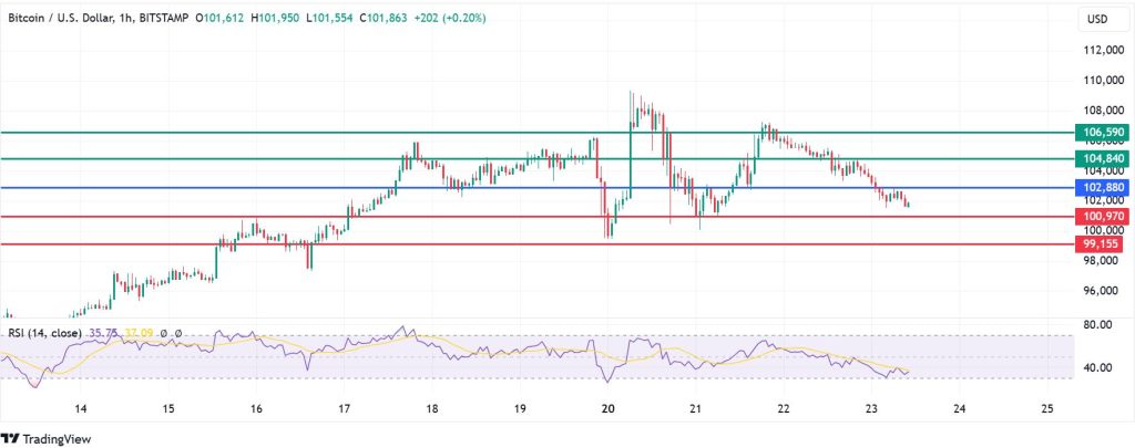 Conversely, moving above $102,880 will shift the momentum to the upside. That will likely see the first resistance come at $104,840. Breaking above that level will invalidate the downside narrative. Also, that could clear the path for further gains to test the second barrier at $106,590.