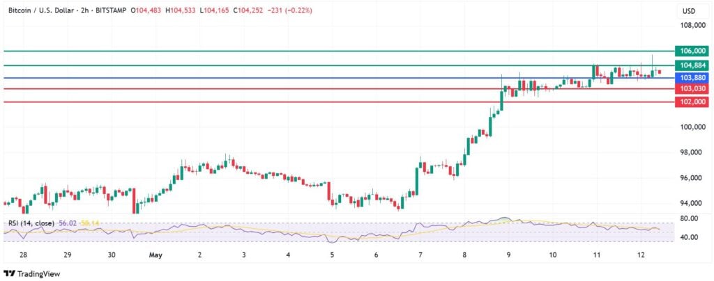 On the chart below, Bitcoin price pivots at $103,880 and the coin will likely meet the first barrier at $104,884. A stronger momentum will break above that level, clearing the path to test $103,880.