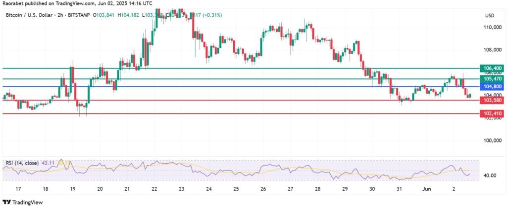 Bitcoin price momentum points to the downside and the sellers will likely stay in control if resistance persists at $104,800. That will likely see the first support established at $103,580. However, an extended control by the sellers will drive the action lower to test $102,410.