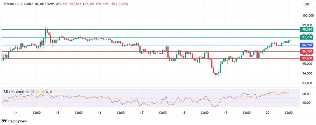 Bitcoin price pivots at $96,960 and action above that level favours the upside to prevail. That momentum will likely meet the initial resistance at $97,780. However, an extended control by buyers will breach that barrier and could test the second resistance at $98,580.