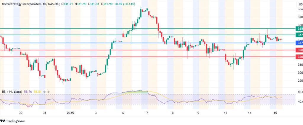 MicroStrategy stock price pivots at $337 and the upside is likely to continue if action stays above that level. The next barrier is likely to be at $347, but the stock could breach that level if the momentum strengthens and potentially test $355.