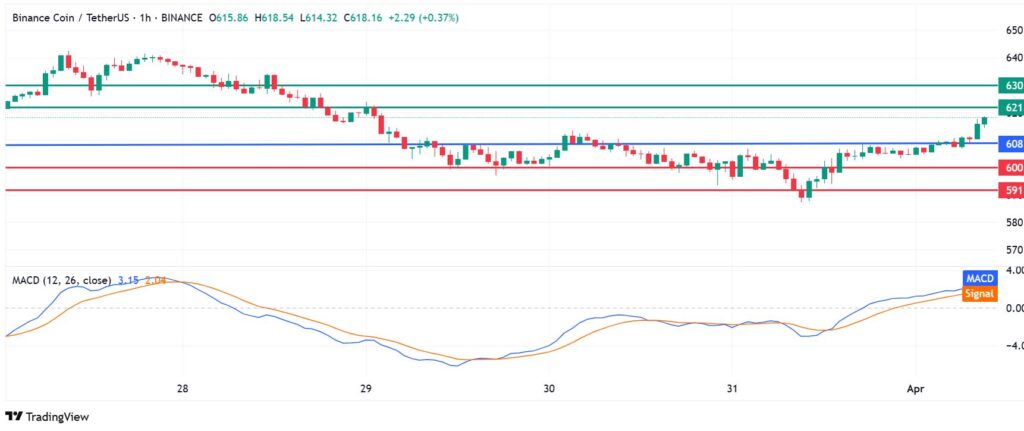 BNB price pivots at $608 and the bulls will be in control if action stays above that mark. Immediate resistance will likely be at $621. However, an extended upward momentum will break above that level and likely test $630.