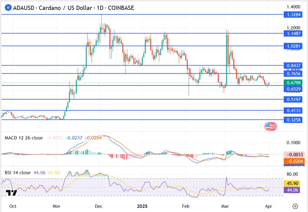 Cardano (ADA) kicked off April on shaky ground, with the price slipping below the $0.68 zone and hovering dangerously close to key horizontal support at $0.6529. The sell pressure that dominated late March appears far from over, as volume thins out and momentum indicators point to more downside ahead.