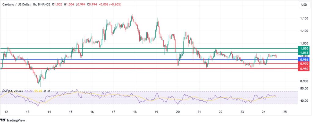 Cardano price pivots at $0.986 and the upside will prevail if the buyers keep the action above that level. That will likely see the coin move higher to encounter the first resistance at $1.013. A stronger momentum will break above that level and could encounter the first resistance at $1.030.