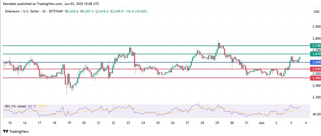 The momentum on Ethereum price calls for further upside above $2,600. The coin will likely meet the first barrier at $2,670. Breaking above that level will signal a stronger momentum that could extend gains to test $2,740.