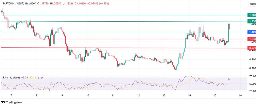 The momentum on Fartcoin price signals a likely continuation of the upside above the $1.109 pivot. Immediate resistance is likely to be at $1.230, but a stronger momentum could break above that level and test $1.300.