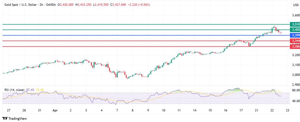 Gold price pivots at $3,399 and the upside will likely continue if the price action stays above that level. With the buyers in control, the first resistance level could come at $3,455. However, extended bullishness could breach that level and test $3,510.