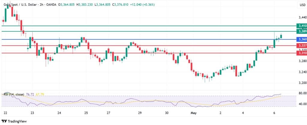 Gold price momentum favours it to stay on the upside if action is kept above the $3,360 pivot mark. The metal will likely meet the first resistance at $3,389. An extended control by the buyers will take the action higher and could encounter the second hurdle at $3,410.