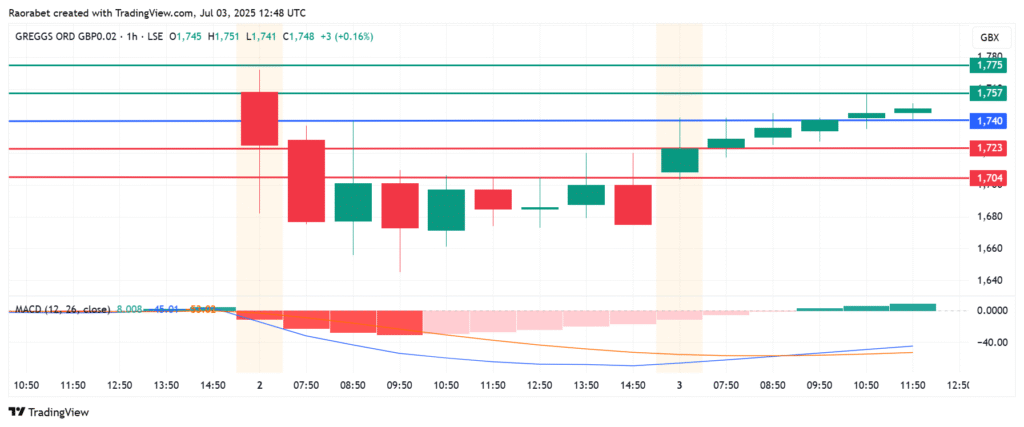 The momentum on Greggs share price calls for further upside above the pivot mark at 1,740p. That will likely see primary resistance established at 1,757p. However, an extended control by the buyers will breach that barrier and could push the action higher to test 1,775p.
