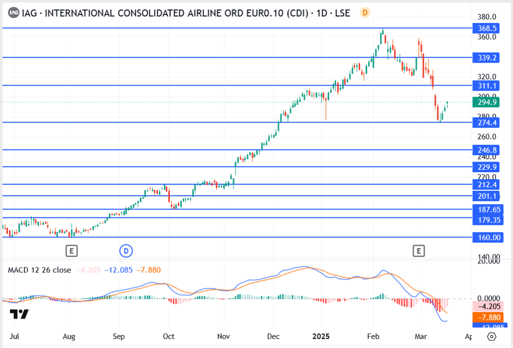The IAG stock price is trading around 294.9p, rebounding from last week’s low of 274.4p. The stock declined by over 12% in the past month, reflecting broader market concerns, but has shown early signs of recovery. The recent bounce from key support levels suggests traders are reassessing their positions, with upcoming economic data and earnings likely to be pivotal.