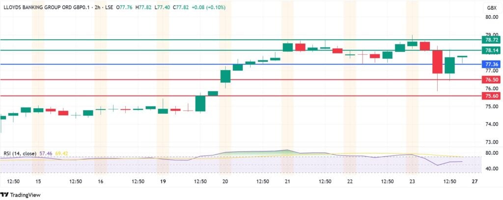 Lloyds Bank share price will likely head further up above 77.36p pivot. With the buyers in control, the stock will likely encounter the first barrier at 78.14p. Breaking above that level will signal a stronger momentum that could clear the path to test 78.72p.