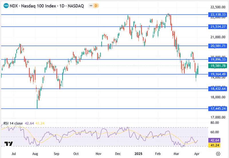 The Nasdaq 100 Index (NDX) is attempting a rebound after a volatile session triggered by fresh global tariff announcements. On April 2, 2025, the U.S. government imposed a 10% baseline tariff on all imports, targeting China, Europe, and semiconductor-producing nations with additional levies on tech components, AI chips, and industrial machinery. In response, China retaliated with tariffs on U.S. chipmakers and cloud computing services, fueling concerns over supply chain disruptions.