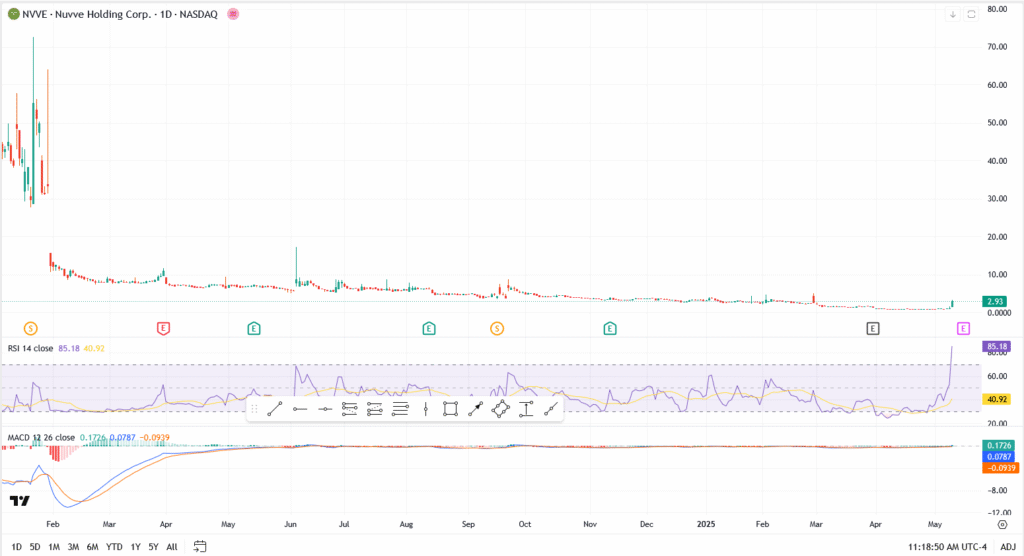Nuvve Holding Corp. (NASDAQ: NVVE), a small-cap company focused on vehicle-to-grid (V2G) technology, exploded higher on Friday, catching fire with retail traders after months of near silence. The stock surged to $2.93, marking a massive 164% gain intraday and snapping a year-long downtrend in a single session.