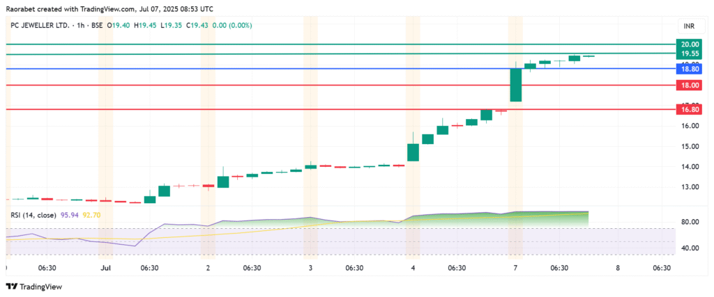 The momentum on PC Jeweler share price favours the buyers to be in control above the pivot mark at ₹18.80. That momentum will likely meet initial resistance at ₹19.55. However, an extended control by the buyers will break above that level and potentially test ₹20.00.