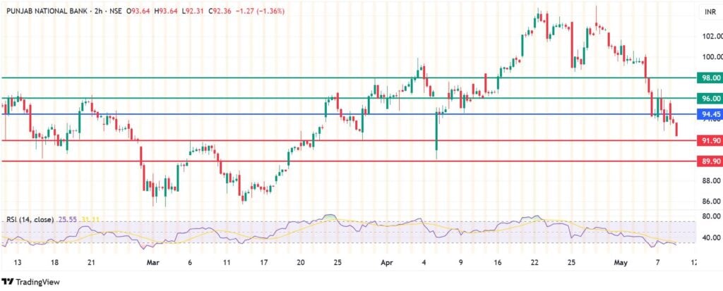 The momentum on PNB share price signals control by the sellers below the pivot mark at Rs 94.45. The stock will likely find its initial support at Rs 91.90. However, that the price action could go lower and test Rs 89.90 if the sellers extend their control.