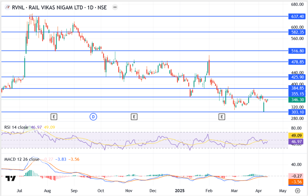 Rail Vikas Nigam Ltd (NSE: RVNL) is showing early signs of exhaustion as its share price hovers near ₹346.30, stuck in a tight range between immediate resistance at ₹355.15 and support at ₹303.10. The recent bounce, while promising on surface, is beginning to look more like a breather than a full-fledged reversal.