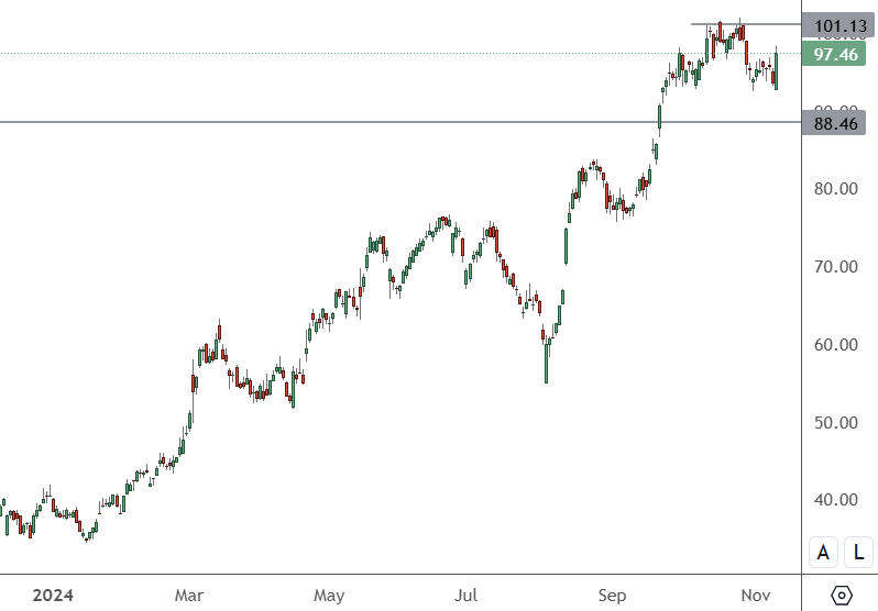SE的价格为97.46美元,并将在88.50美元至100美元之间寻求突破。