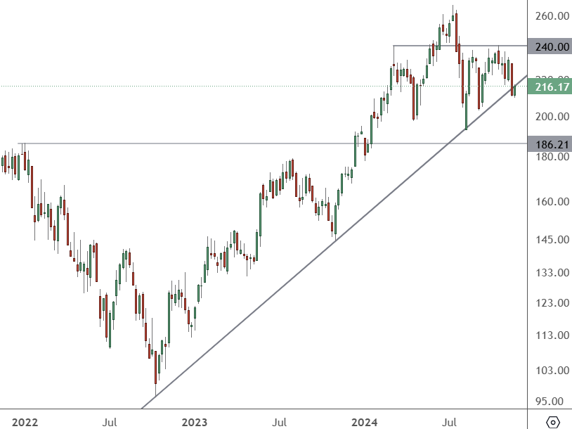 SOXX的价格已经从7月份接近260美元的高点回落,在突破上升趋势线后,目前的交易价格为216美元。如果它不能守住这一支撑位,就可能形成回调。