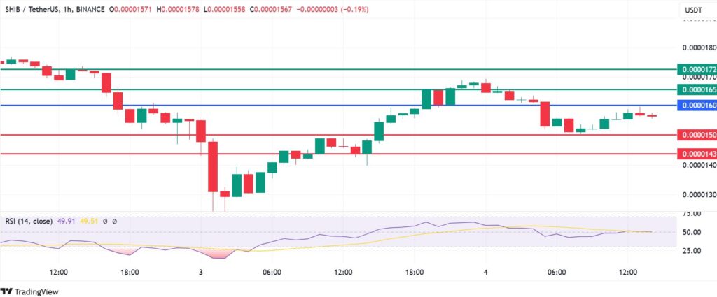 Shiba Inu price pivots at $0.0000160, and resistance at that level will signal control by the sellers. Immediate support will likely be at $0.0000150. However, a stronger momentum will break below that level and potentially test $0.0000143.