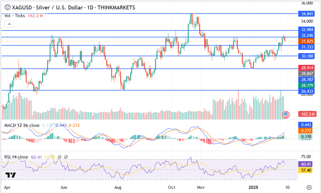 - RSI at 60.41 indicates silver is approaching overbought territory but still has room for further gains if buyers remain in control.