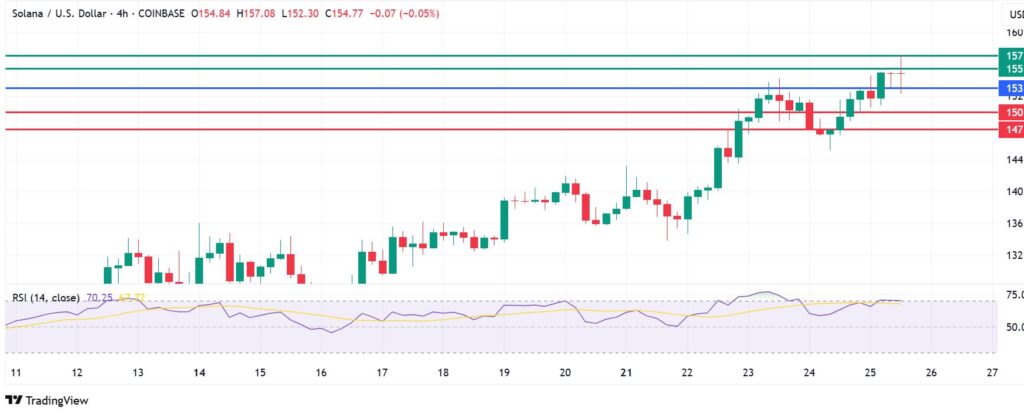 Solana price stayed on the upside trajectory for the fourth successive day, sustaining action above the $150 mark for the third successive session. The coin traded at $153 at the time of writing, up by 0.5% on the daily chart to take its weekly gains to 13%. SOL price has also reclaimed $154 for the first time in over a month, underlining the strong bullish hold.