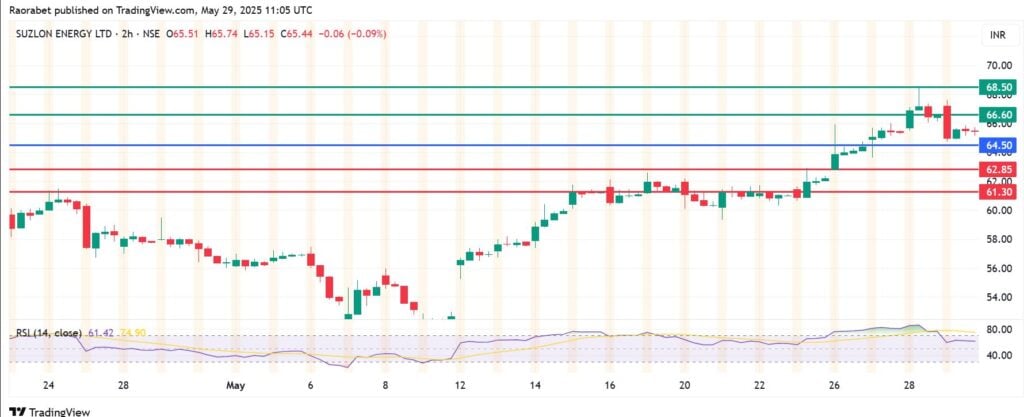 Suzlon Energy share price pivots at Rs 64.50 and the momentum calls for action above that mark. The stock will likely meet initial resistance at Rs 66.60. However, a stronger momentum will breach that mark and could send the price higher to test Rs 68.50. Conversely, action below Rs 64.50 will signal the onset of downward momentum. That will likely see the first support established at Rs 62.85. Breaking below that level will invalidate the upside narrative. Also, the resulting momentum could send the stock price lower to test Rs 61.30.