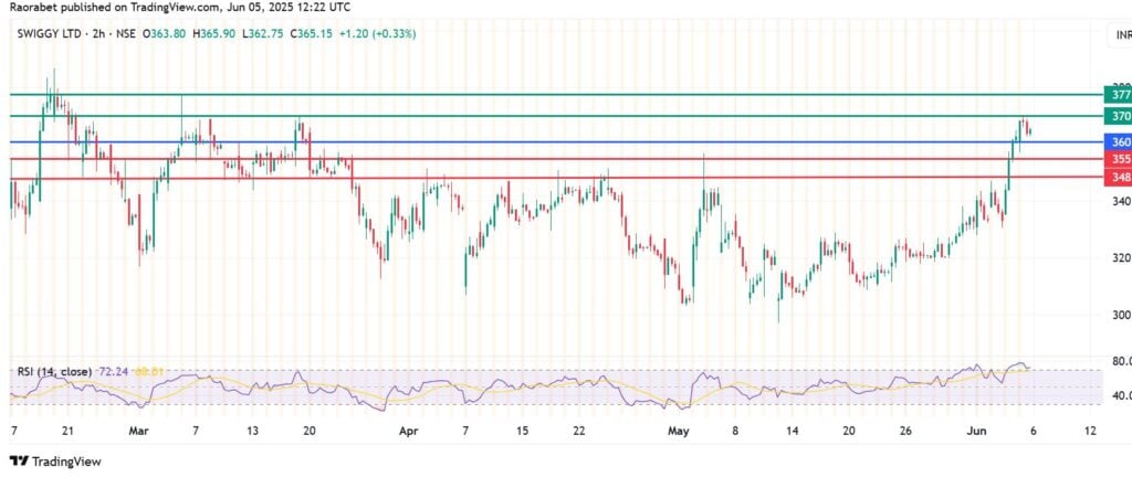 The momentum on Swiggy share price calls for further upside above the pivot mark at Rs 360. With the buyers in control, the upside movement will likely meet the first resistance at Rs 370. However, a stronger momentum will clear that barrier and could extend gains to test Rs 377.