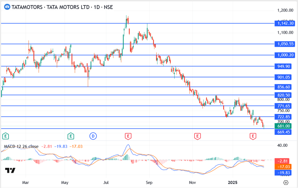 Tata Motors (NSE: TATAMOTORS) slipped to a fresh 52-week low of ₹669 today, extending its recent downward trend. The stock is now down over 10% this year, driven by weak earnings and increased competition in the electric vehicle (EV) space. Investors are cautiously watching for signs of recovery as the company implements long-term strategies to regain momentum.