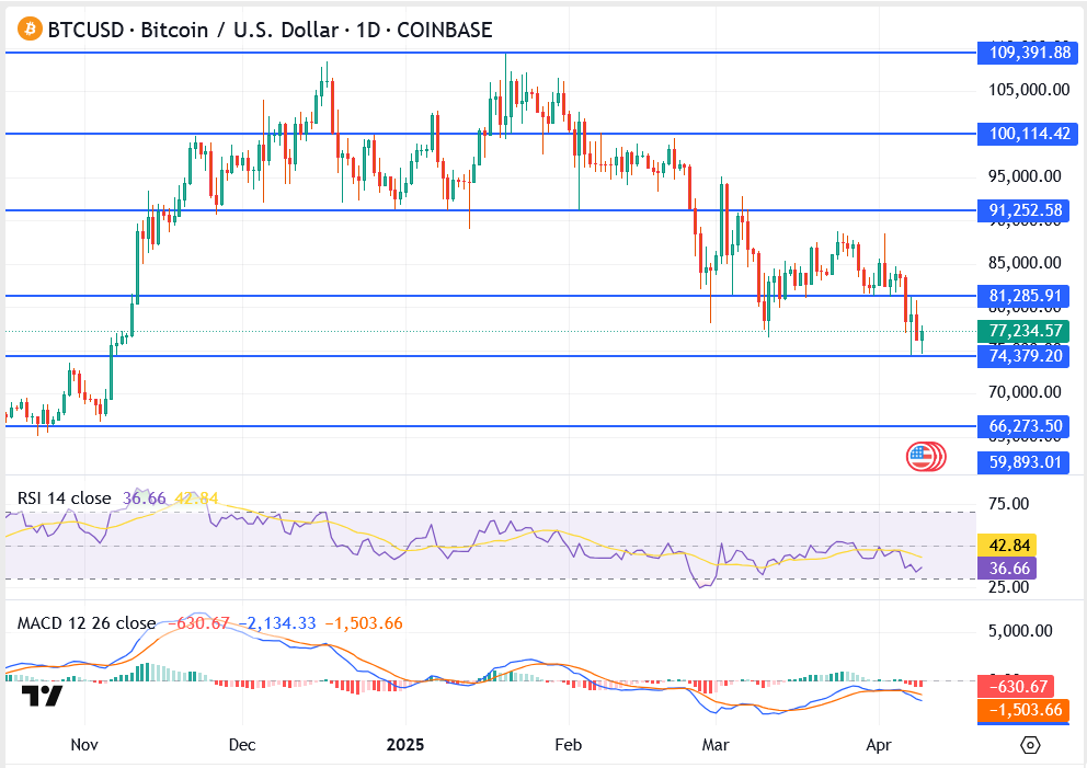 The market remains in a wait-and-see mode. The broader bullish structure from Q1 is intact, but only just. If BTC closes below $74K on volume, the selling pressure may intensify. Bulls need a reclaim of $77K to regain momentum.