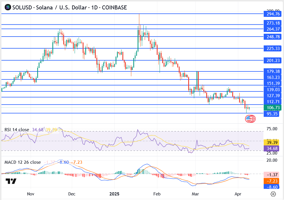 Solana’s price has dropped below $112 and is currently fighting to hold the $106.73 support area. This level is critical. A daily close below this zone could trigger a rapid drop toward $95.35 — where stronger historical demand has previously emerged.