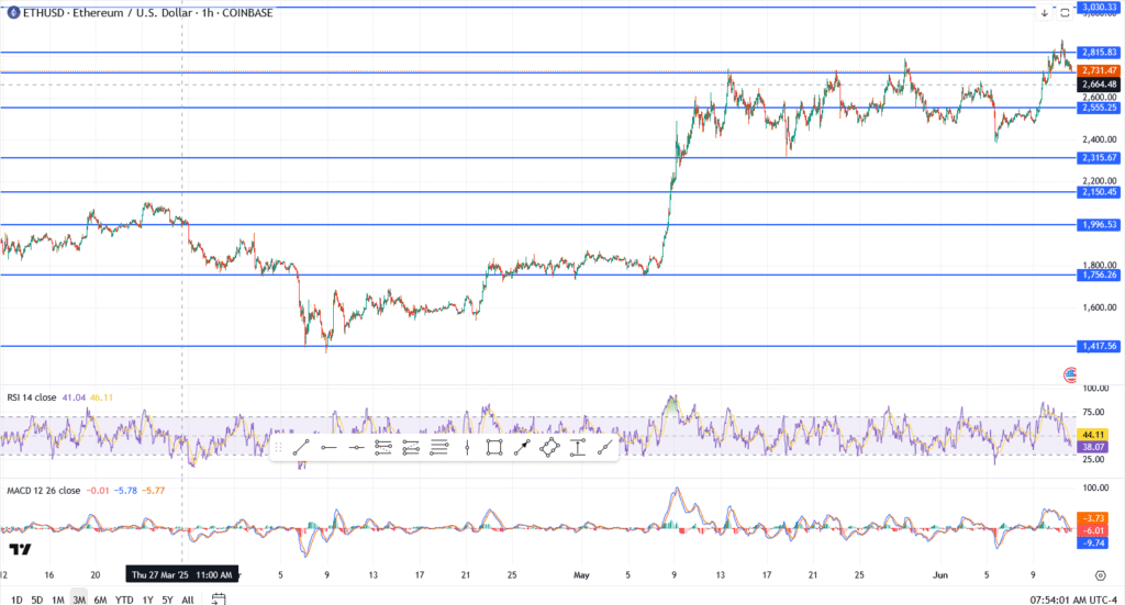 Ethereum is cooling off a bit. Price hit resistance just shy of $2,800 and has been drifting since. Not a breakdown, just a breather. After a solid run-up in early June, bulls look tired, and the chart is showing it.