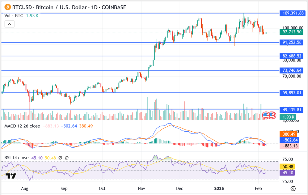 Bitcoin is trading at $97,713, consolidating near a critical level as it struggles to regain bullish momentum. The coin has held support around $91,252, but upside movement has been capped below $100,000.