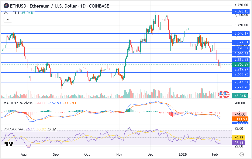 Ethereum is trading around $2,719, with the price recently bouncing off $2,555 support. The coin is under pressure as it struggles to reclaim the $3,000 mark.
