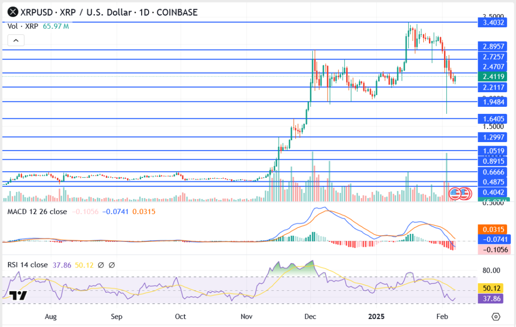 - XRP is trying to stabilize above $2.41, but further weakness remains a risk.