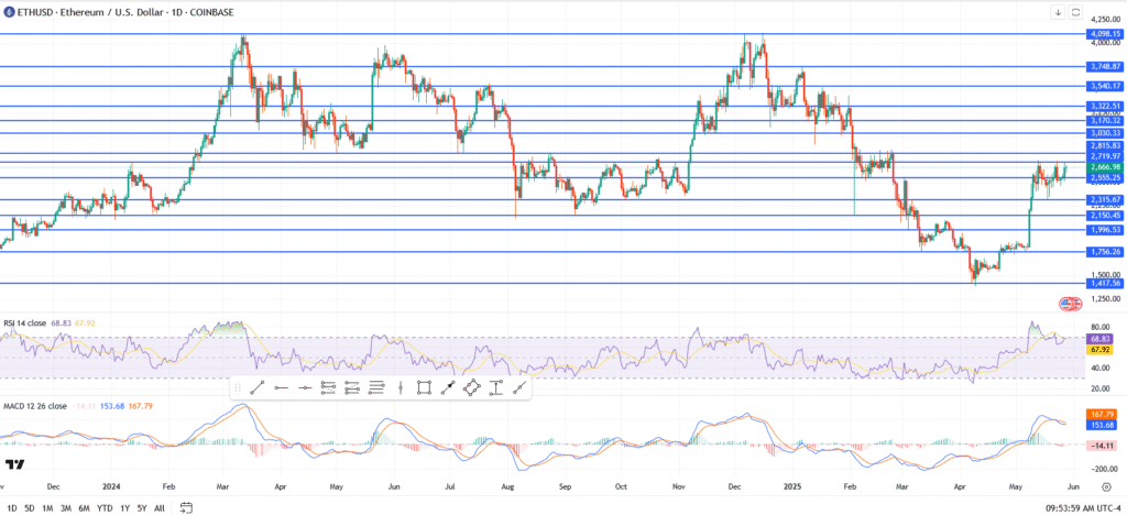 Momentum is cooling. RSI came close to 70 and now sits around 66, while the MACD is rolling over. If ETH gets turned away again at resistance, the path back to $2,451, maybe even $2,247, is in play.
