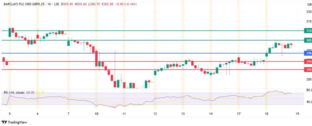 Support: BARC price will likely find initial support at GBX 294. Action below that level will invalidate the upside narrative. That could clear the path to test GBX 290.