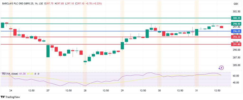 Barclays stock price pivots at GBX 296.05 and the momentum indicator shows control by the buyers. That will likely see BARC move to the first resistance at GBX 298.50, beyond which the next target will be at GBX 300.35.