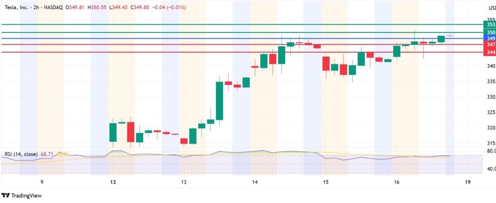Pivot: TSLA price pivots at $349. The momentum favours the upside.