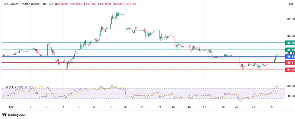 USDINR was up in the Asian trading session, buoyed by ongoing trade talks between Indian and the US. The pair was at 85.45 at the time of writing, up by 0.3% on the daily chart. That said, it is still struggling for a decisive upside momentum, with the dollar still near four-month lows.