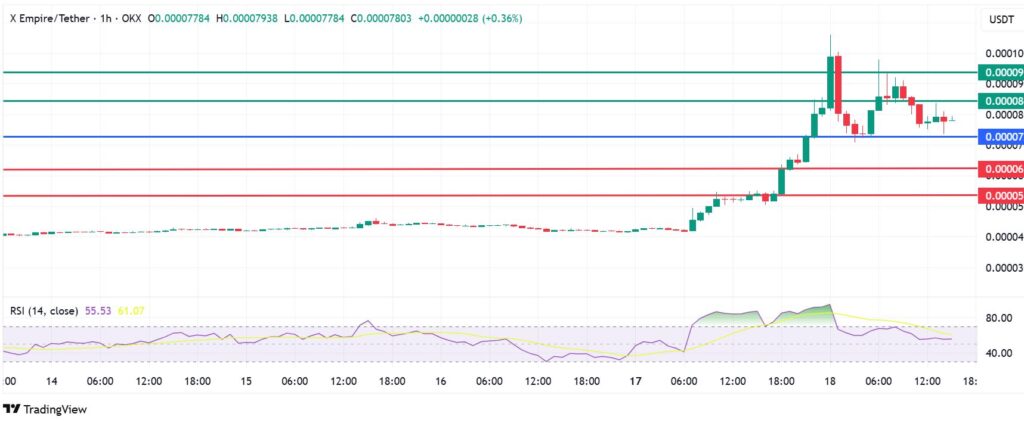 X Empire Coin price pivot mark pivots at $0.00007 and the sellers will be in control if action stays below that level. That momentum will likely send the coin lower to the first support at $0.00006. However, a stronger downward momentum will break below that level and test the second support at $0.00005.