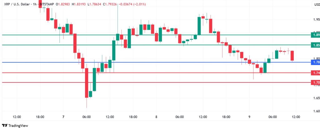 The momentum on XRP Price signals control by the buyers if the price stays above 1.78. That will likely see it encounter primary resistance at $1.85. However, the price could clear that hurdle and test 1.89 if the buyers extend their control.