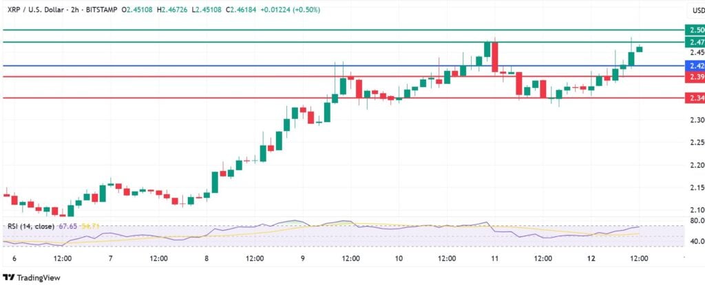 The momentum on XRP price calls for further upside above $2.42. The coin will likely encounter the next barrier at $2.47. However, a stronger upward momentum will go above that mark and could go on to test $2.50.