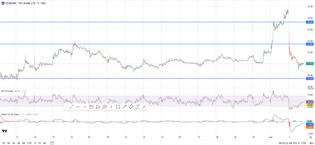 YES Bank stock plunged 7.2% on Tuesday after a large block deal saw nearly 3% of the company’s equity change hands during the session. The move caught traders off guard and sent the stock sharply lower from intraday highs near ₹22.80 to lows around ₹21.00.