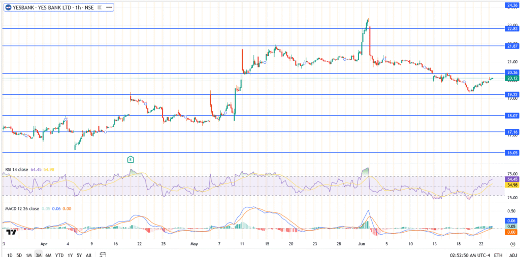 The RSI is hovering around 64.45, inching close to overbought territory. At the same time, Yes Bank is running into familiar resistance near ₹20.36. A level that’s blocked rallies twice this month. If buyers can’t clear it convincingly, the stock could run out of steam and see a pullback.